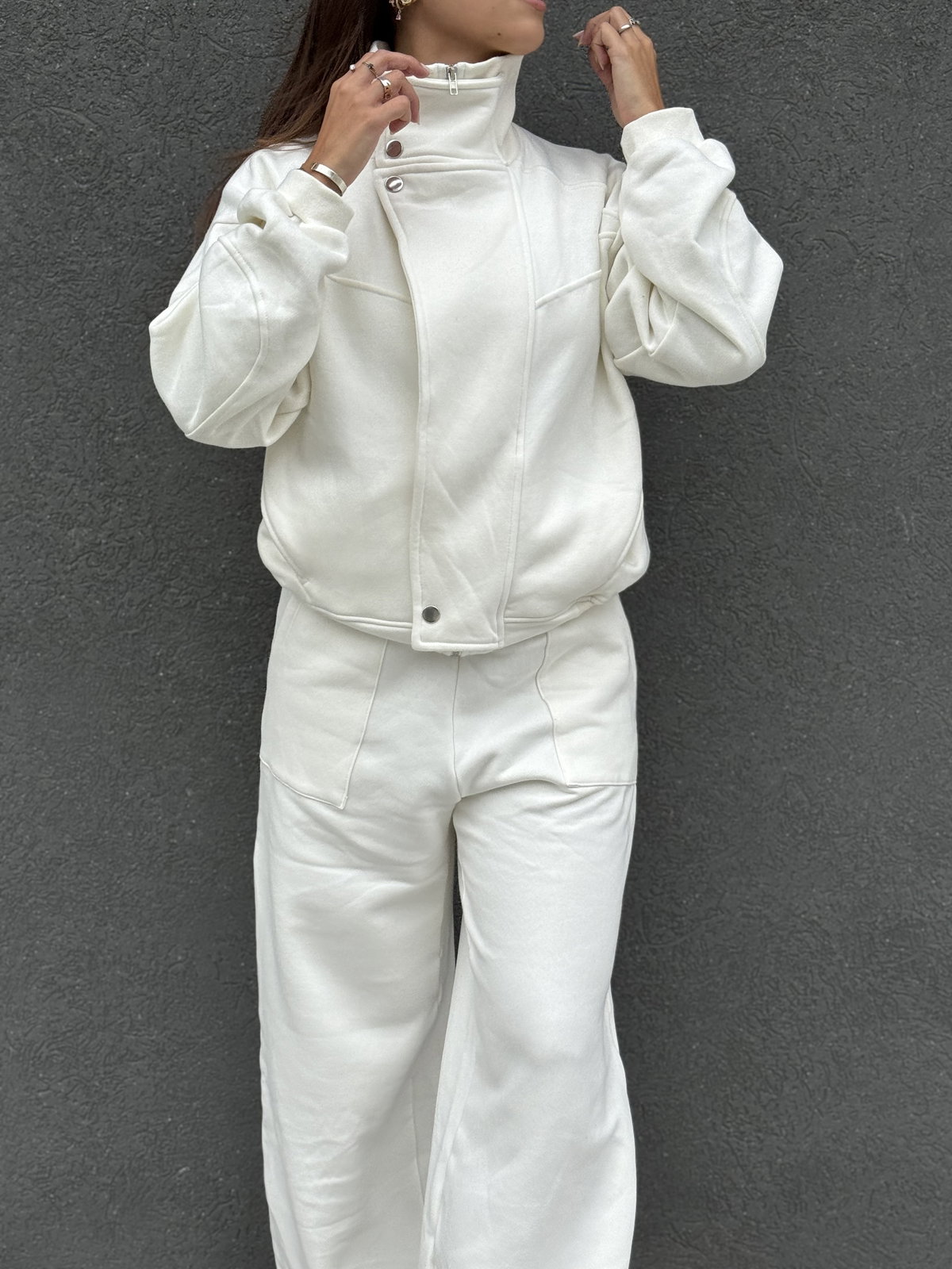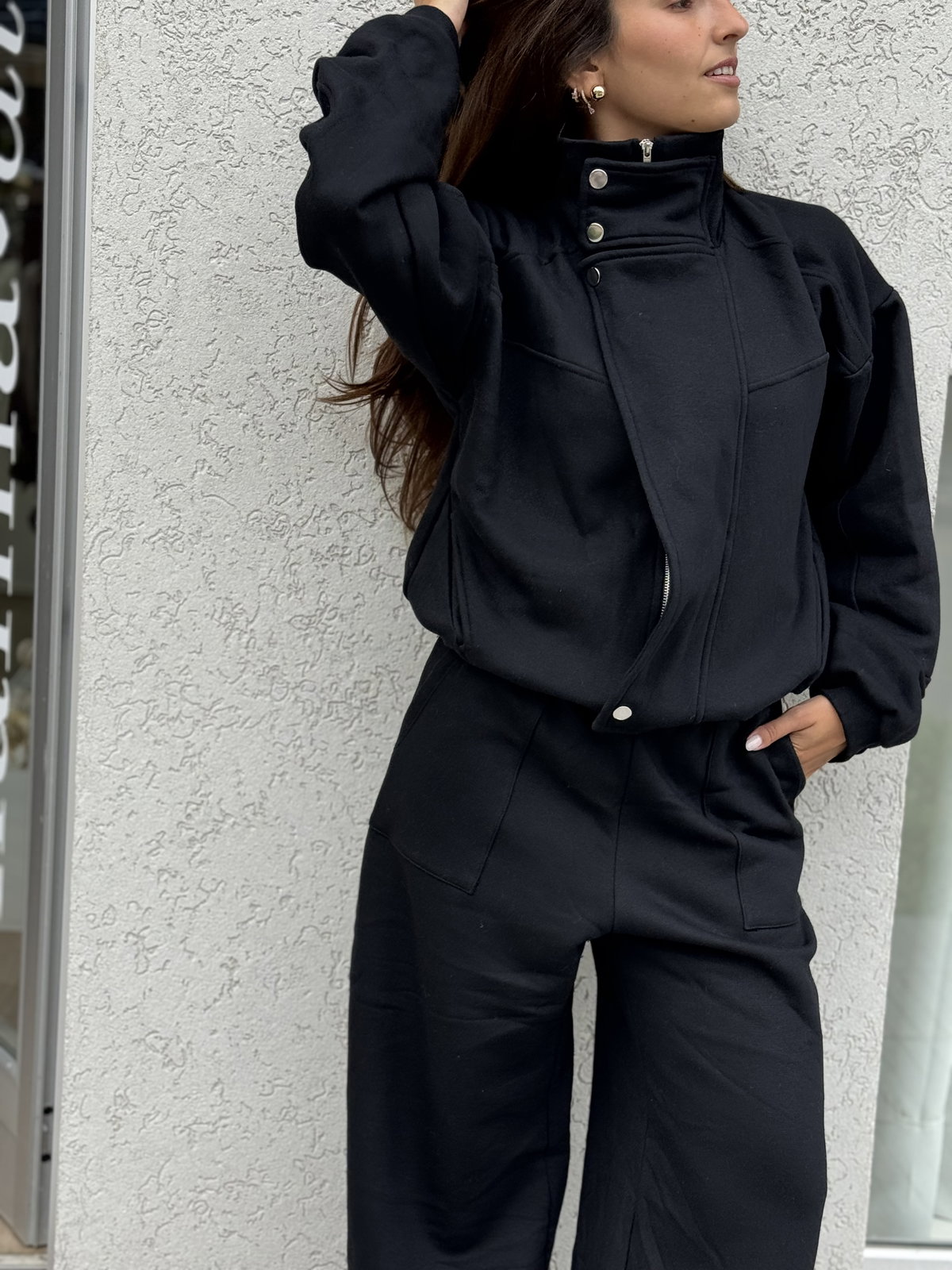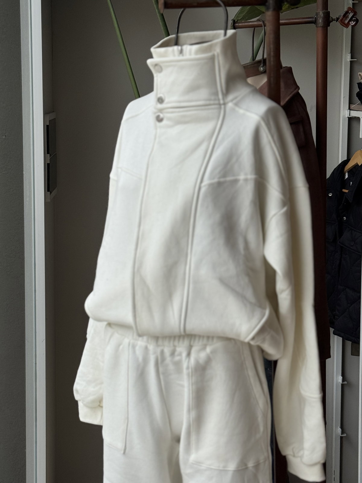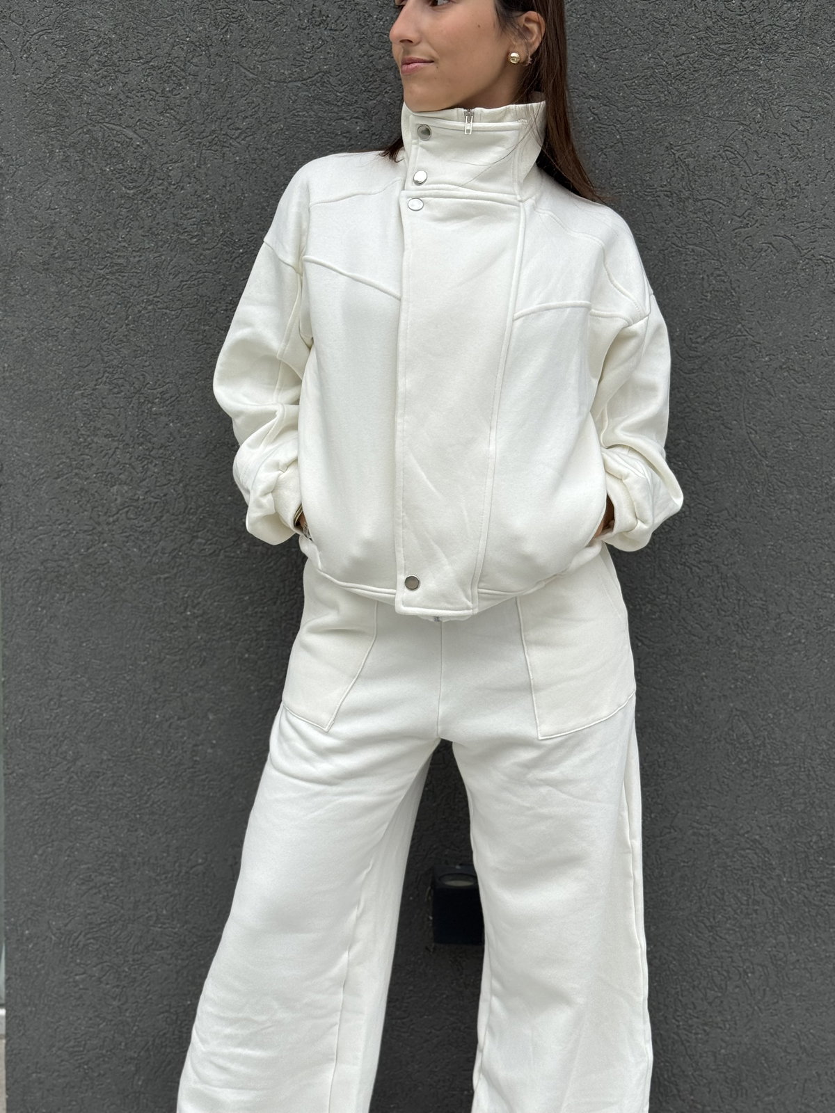 Campera confeccionada en algodón frisado, con detalles de costura en el delantero, cierre de aluminio y broches en delantero y cuello.
