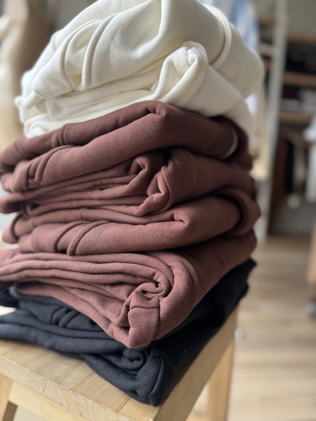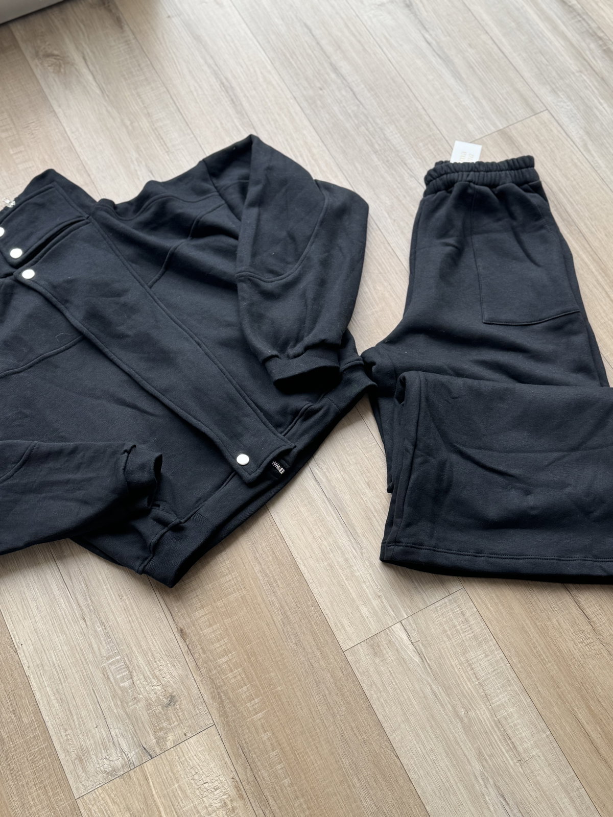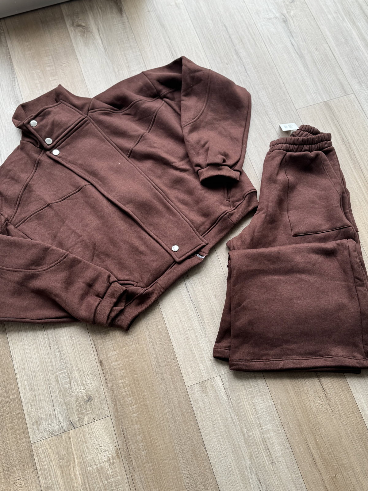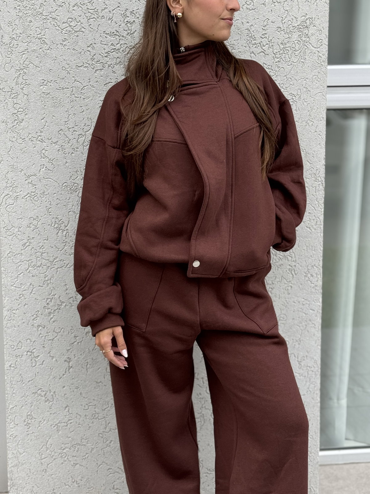 Campera confeccionada en algodón frisado, con detalles de costura en el delantero, cierre de aluminio y broches en delantero y cuello.