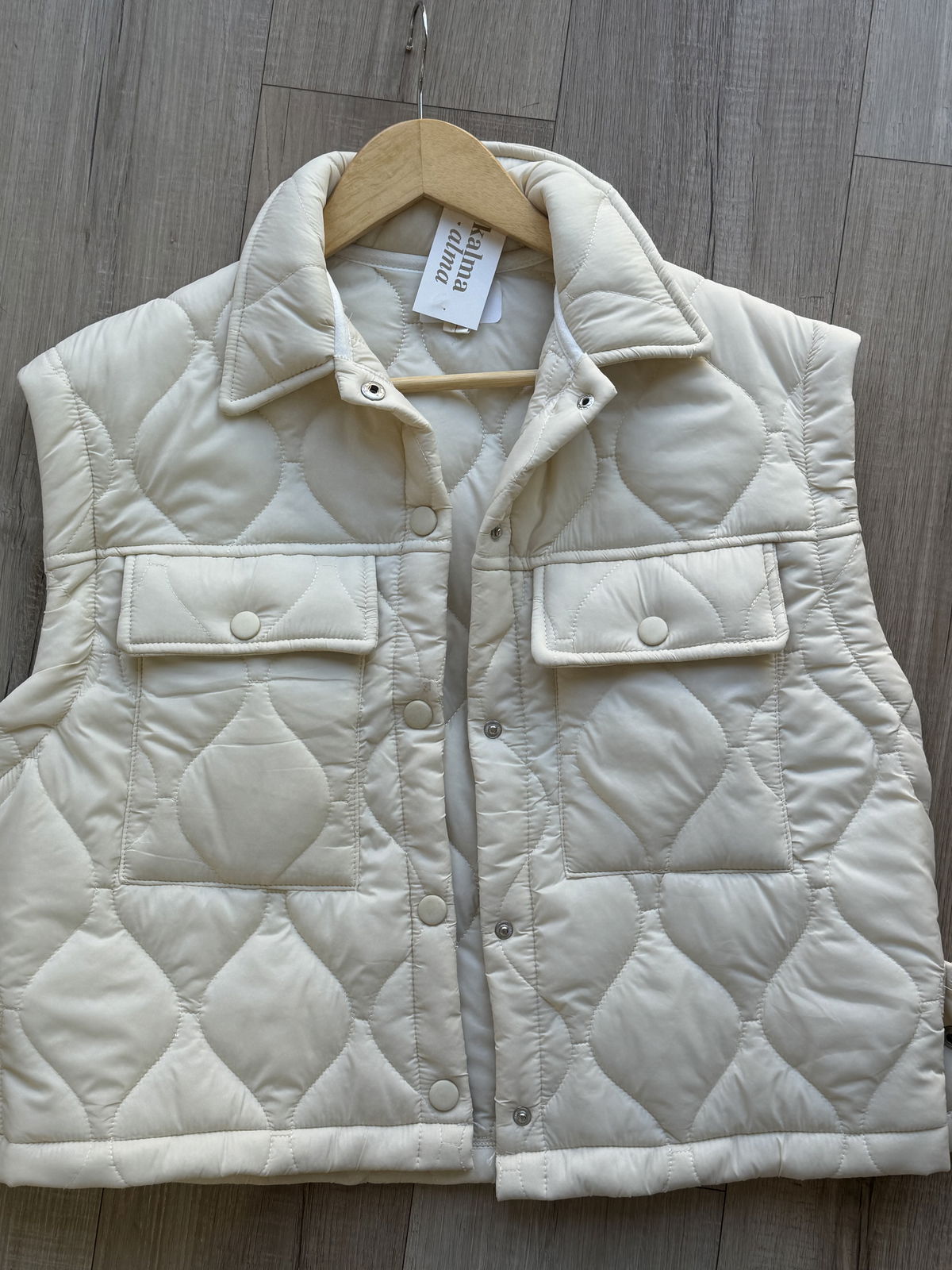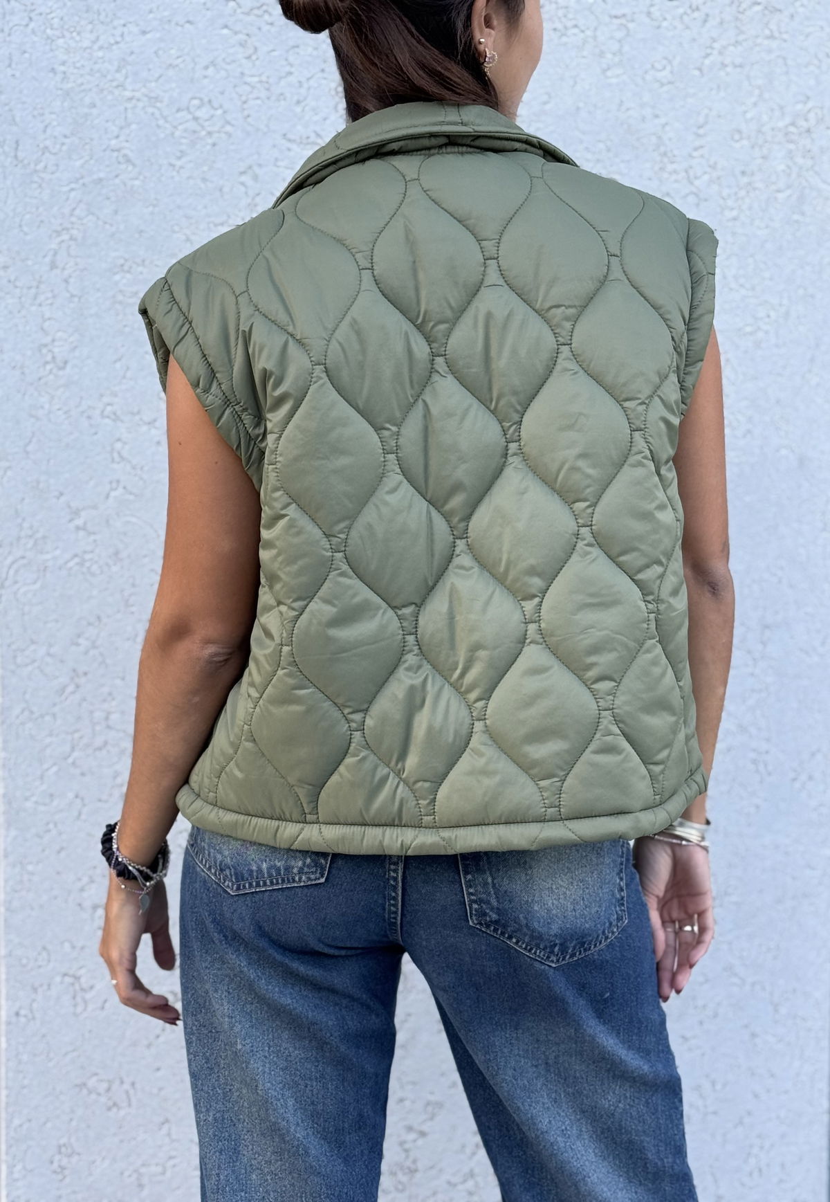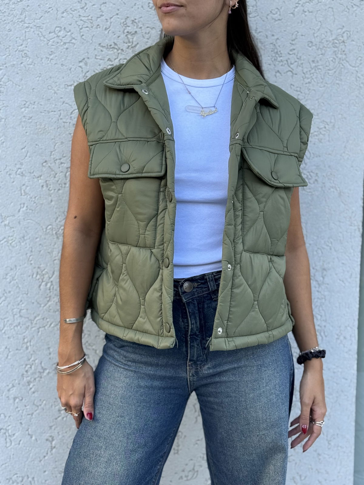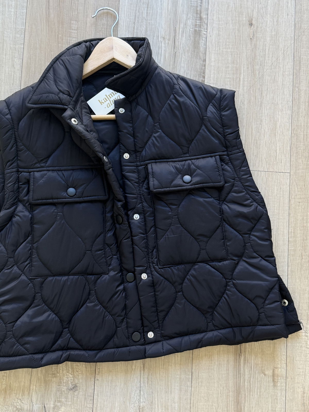 Chaleco matelaseado liviano ideal para sumar una capa de abrigo sin perder comodidad. Su diseño moderno con bolsillos frontales y broches metálicos lo convierte en una prenda práctica y canchera para el día a día.